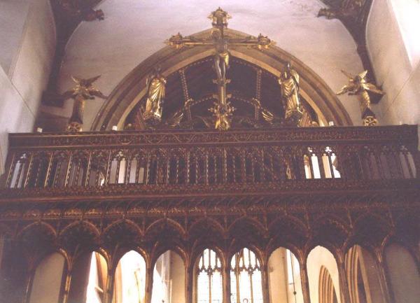 There is a feast for you here! In the 1920s he added the sumptuous rood-loft and on its parapet he placed the great rood crucifix, the figures of Our Lady and S. John and a pair of six-winged seraphim. Comper re-ordered the sanctuary, although it has been altered again since then, but his beautiful sanctuary lamps have survived. He designed the war memorial plaque in the south aisle, the glass in the great East Window and in the north-west window. Finally, in 1932, he created the graceful font cover.