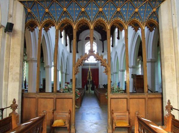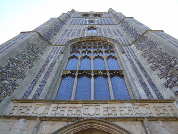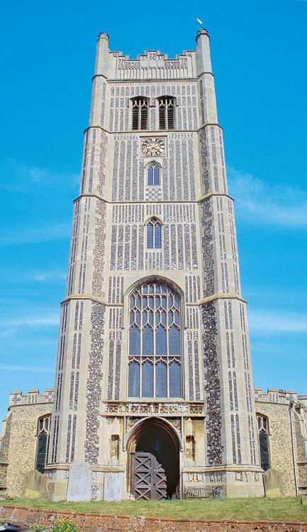 This is a premier church in a county of fine churches. The 101ft tower, with its array of elaborate flushwork, grand stone parapet, noble polygonal buttresses, etc., is a masterpiece of c.1450-88, displaying John De La Pole’s arms, as does the two-storeyed south porch, which has superb 15th century stonecarving. The south doorway has Early English dog-tooth and stiff-leaf carving which is 200 years older. The fan-vaulting beneath the tower, the pinnacled, cusped and crocketed tomb recess of the 1300s, the south chapel parapet of Tudor brick and terra-cotta are just some of the architectural details to be savoured here.