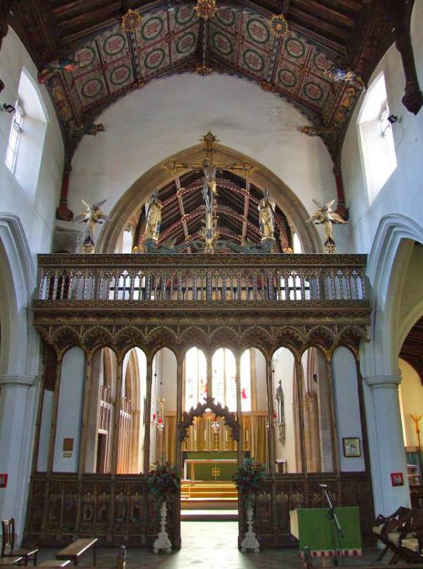You will want to be ‘prone on a pew’ in order to enjoy the 15th century arch-braced nave and chancel roofs, with a (repainted) canopy of honour to the rood. Then there is Eye’s magnificent rood screen – one of East Anglia’s finest – work of c.1480 up as far as the underside of its loft and with 15 exquisitely painted ‘Old Masters’ of saints (including three English kings), with the emblems that identify them. It’s worth getting on your knees to have a careful look at these intriguing characters, which were wonderful visual-aids to teach the Faith to medieval people.