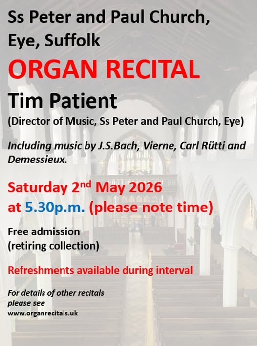 Thanks to our supporters, benefactors and helpers, the church has acquired, among many new features, an assembly room and a magnificent historic organ, on which visiting international organists have performed. Our work continues. Our thanks go to all those whose support and generosity have enabled our church to flourish. On their behalf we would like to invite you all to visit Eye and its magnificent church… and to stay awhile to sample its worship, music and its welcome.